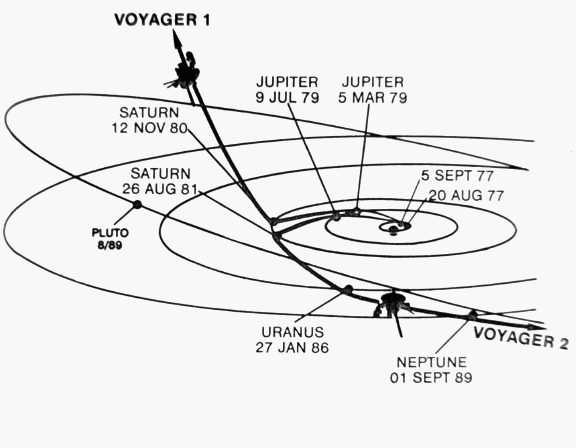 Pour piloter une sonde Voyager, on doit calculer en permanence la position et la vitesse de la sonde, afin d'évaluer la probabilité d'atteindre l'objectif en temps voulu; ces calculs permettent de rectifier la trajectoire au moyen des réacteurs de position. Parmi les forces qui modifient la trajectoire, on tient notamment compte de l'attraction gravitationnelle, mais aussi de l'action des photons solaires. Les calculs de position et de vitesse se fondent sur deux types de données : les données radiométriques dues aux signaux radio émis par la sonde, et les données optiques dues aux appareils de prise de vues installés à bord. On enregistre la trajectoire en continu, afin de calculer les manoeuvres de correction nécessaires, à l'aide des ordinateurs situés au sol. En survolant le pôle Sud de Saturne, Voyager 1 a subi une force gravitationnelle qui a l'a déviée hors de l'Ecliptique (le plan de l'orbite terrestre) ; La sonde se trouve actuellement à 14 unités astronomiques au-dessus de ce plan (une unité astronomique est égale à la distance moyenne entre la Terre et le Soleil, soit environ 150 millions de kilomètres). Voyager 2 se trouve toujours dans le plan de l'Ecliptique et devrait survoler le pôle Nord de Neptune le 24 août 1989 ; elle sera alors déviée au-dessous du plan de l'écliptique. |