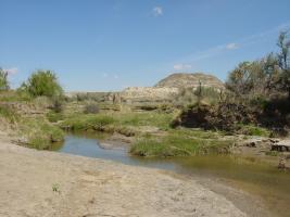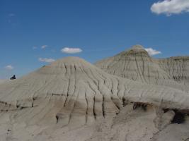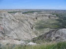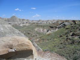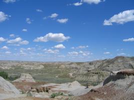 Encore quelques heures de route pour arriver au Dinosaur Park. Le décor change complétement, nous sommes dans les badlands. Delphine se met à la recherche des cow-boys plutot que des coureurs de bois. Nous passons la journée dans ce park et plantons la tente (qui n'a jamais encore servi !) dans le camping attenant. La visite est un peu décevante puisque de dinosaures, nous ne pourrons en voir que trois, protégés dans un local sous vitres. Le reste se stiué dans le musée local mais la partie la plus importante se situe dans une autre ville (Royal Tyrrell Museum à Drumheller). La géologie est néanmoins surprenante et fait penser au désert australien. Des milliers d'animaux ont été ici découvert. Ils appartiennent tous à la même époque : 75 millions d'années. Le site est toujours en fouille et la pluie permet de dégager naturellement les vestiges d'anciens animaux.